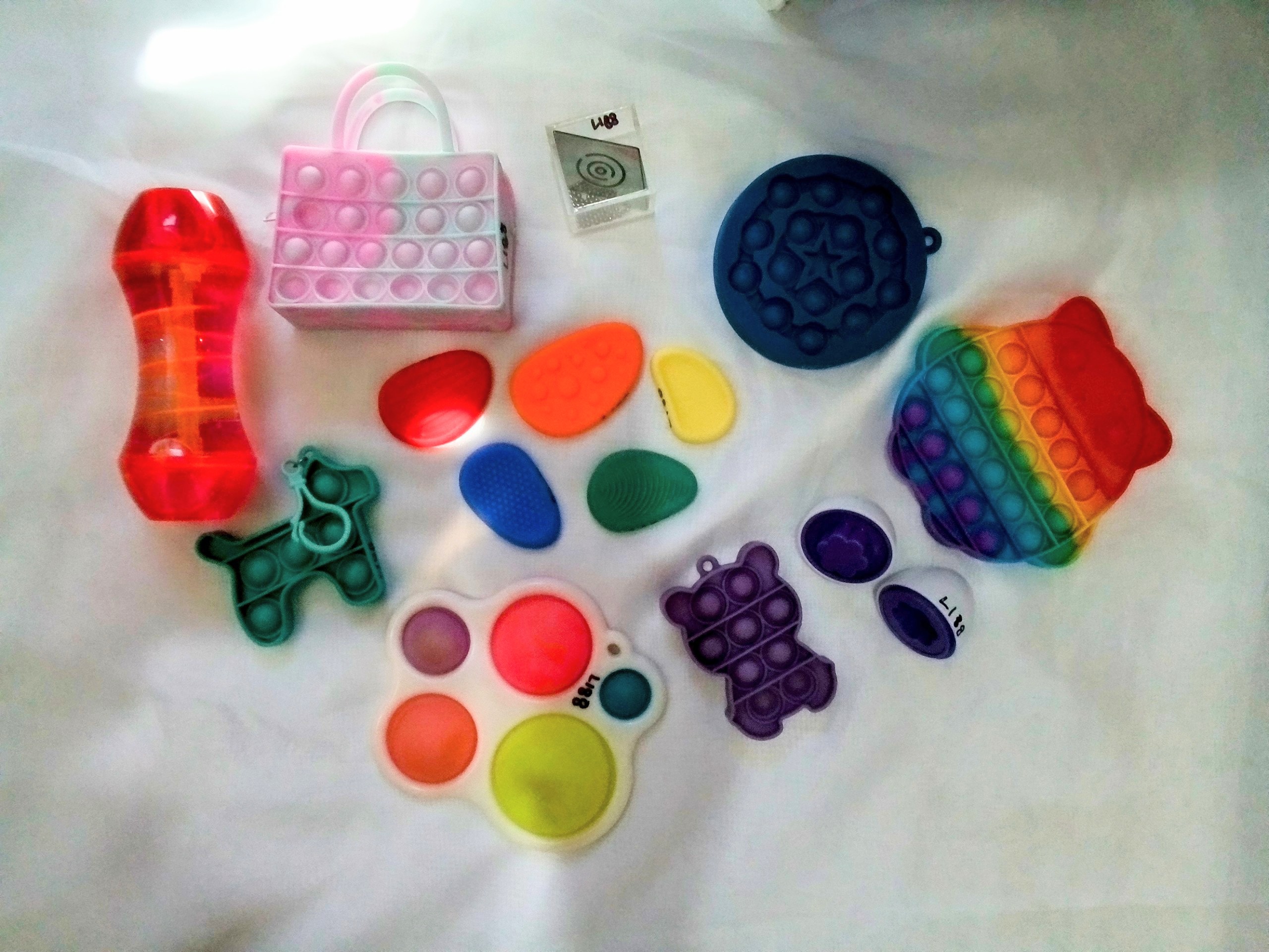 6 X pop it toys (bag, dog, teddy, owl, star, and white piece) 5 X textured pieces 2 X egg halves 1 X illusion cube 1 X lava wand
